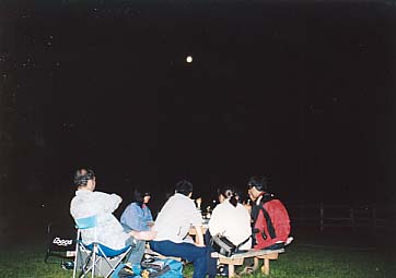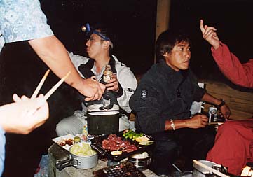この日は、解凍してすこし日がたっているので生じゃない方がいいだろうと言うことで、焼き肉&スジ肉の煮込み汁ということになった。野菜も交えて、腹も心も大満足!というわけで宴会のほうも佳境に入っていくのであった。見よ、このまとまりのなさ!(爆)。みんな好き勝手なことやってるぞ。 |