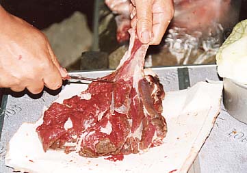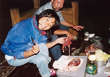 そして翌日は、まだ肉片になっていない、丸のままのブロックをいくつもいただいた。昨日のグループはあらかた出発してしまっているので、今晩はこれを全てこちらの手で消費せねばいけなかった。幸い、POPEYEさんをはじめとする精鋭約10人が集まった。食べる前にはまず切り分け作業が必要だ。まな板なんて高級なモノは持っていないが、幸い空の牛乳パックがあったので、それを開いて代わりとする。 |