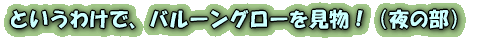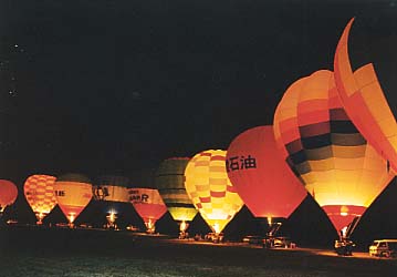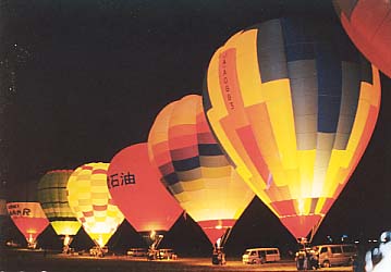 各バルーンが勝手にバーナーをつけたり消したりするとライトアップにならないこともあって、放送の指示で一斉にバーナーが点火される。しかしまあ色々な事情があるのか、本当に全バルーンがライトアップされるのはせいぜい数秒間。その数秒を何とかしてとらえようと、カメラマン諸氏はファインダーを真剣に見つめている。しかし、Takemaは「おーい、のんびり来たせいで最前列が取れなかったよぉ。うーん、こっちを撮ろうとするとどうしてもおっちゃんの頭を写すことになっちゃうなぁ、いかんいかん」などと、出遅れを後悔しながらの撮影なのである。そんなわけでやっと撮れた写真がこれ。