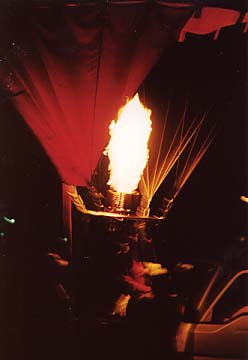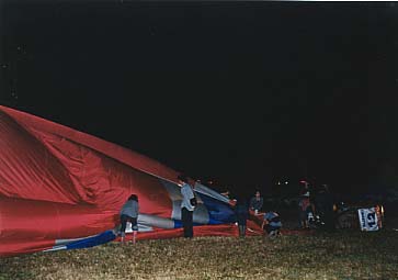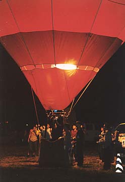 いよいよバルーンに火が入った。当然ながらバーナーをつけ続けると浮力が発生して浮いてしまう。しかし熱気をケチると気球全体が何となくしぼんだ感じでみすぼらしくなる。したがって微妙なところでの「寸止め」が必要となってくるわけで、クルーの腕の見せ所といえよう。