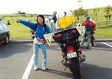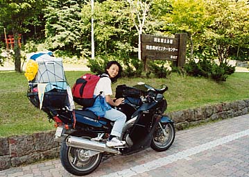 さて、上士幌4日目、いよいよ我々は多和めがけて旅立つこととなった。DANさん、おとう&サトコちゃんは明日移動するというのでまったりモード、それにつられてうちらの撤収スピードも上がらない。しかも、ネットで知り合ったサルRくん(Takemaの先代バイクと同じCB400SF-Rでツーリング中)に至っては、フェスティバルの「自転車一本橋にトライ!」というようなアトラクションで見事3位をゲット、豪華賞品の桃1ケースを見せびらかしてくれたくらいだったのだ(その関係の写真についてはこちら)。 |
