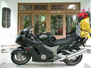 もともとバイクで行くということは電話で連絡してありました。そうしたらご主人から、「玄関前の屋根の下に止めていいですよ」とのありがたいおことば。「やっぱりバイクの場合は濡れちゃうと大変だしね」とのことで、おかげで必要最小限の荷物(左サイドパニアに集約済→上右写真では既に取り外してますね)以外はくくりつけたままで済みました。さらにはこの夜、かなりの雨が!でも、屋根あり駐輪場に停めさせていただいたので全然気にならず、「ふ〜ん、降ってるのね」くらいの気持ちでいられました。ありがとうございました。