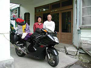 さて、いよいよ最終日。朝一番で露天風呂に行った時(前ページ)にも雨の気配はなかったので、今日も雨具を着ないで行けそうな気になってます。玄関前で地道に方向転換を行い(かなり小刻みに何度も)、ようやくこのように記念撮影。「いやぁ、私はいいよぉ」とおっしゃるご主人、いつまでもこの宿を続けてくださいね。また来ます。あ〜良かったなぁ。