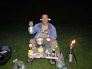 吹上温泉キャンプ場2日目の夜。耳にこよりティッシュを押し入れて、それでもこれから飲むぞ&夕食タイム。むうぅ、こうやって見ると「レレレのおじさん」みたいだこと。