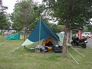 しかし、雨も長くは続きませんでした。せいぜい30分くらいのものだったでしょうか。午前中の海霧を合わせても、今回のツーリング、走行中に雨が降ったのはこの日の2時間弱だけ。やっぱついてましたね。雨がやむとおしんこどんも起き出して後ろで歌など唄っています(本人いわく「眠気防止のため」。さもありなん。でも、ものすごくご機嫌そうに聞こえちゃうんだよね)。鶴居に近づくにつれて湿気の方もなくなり、キャンプ場に着く頃には雨具もあらかた乾いていました。