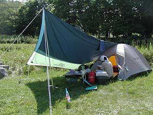 そんなうちらも、遅々たるスピードではありながらも撤収作業に入り始めました。寝袋をスタッフザックに詰め、タープを半面外し(上の写真がまさにそれですね)、そしてテントのフライを外し、フレームを外し‥たところで、管理人の宮代さん登場。しばし(いや、かなり)話し込ませていただくことに。今日はかなり暑くなるということ、このキャンプ場での楽しみ、自分が前回訪れたときのこと云々。