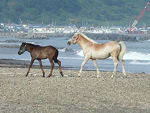 なぜこんなところで馬が放し飼いにされているのでしょう?しかも浜辺で全然草のないところでくつろぐ彼ら、日がな一日こうして過ごしているのでしょうか?実は、海岸の防波堤の外側に(!)小さな牧場があって、そこで飼われている馬たちのようです。草は防波堤の脇に牧草ロールが置いてありますから、どうやら「そっちで食べて浜辺でくつろぐ」というのが彼らの日課なのでしょうか?それにしても何だか不思議な後景でした。