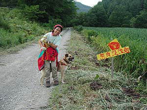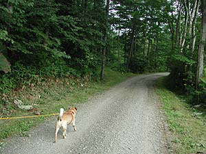 さて、再びYAMANONAKAカムイミンタラキャンプ場に戻ったのは15:30ころ。再び管理人の宮代さんと話していたら、ふとしたことから、こちらで飼われている愛犬マッキーのお散歩を買ってでることに(笑)。だいたい3km、林道を川に沿ってさかのぼり、3つ目の橋あたりまでが所定のコースですが、もうここから奥は山おやじが出てもおかしくないエリア。まぁご夫妻は毎日行かれていることだし、マッキーもいるしということで、こういうのが好きなおしんこどんに半ば強引に引き受けさせたというのが本当のところ(笑)。