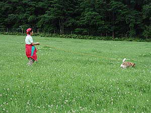 林の中の道を行き、お約束の三つ目橋のたもと、今は使われていない?牧草地に到着!ここで草地に入ったマッキー君は、喜びのあまりに走り出しました。いやぁその引きの強いこと強いこと。上の写真ではそうも見えませんが、このあと「引きずられるおしんこどん」、大変そうでした。