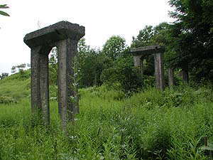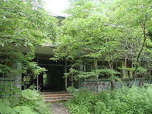 ありましたありました。コンクリ2階建てのかなり立派な建物。ほぼ全てのガラスはうち破れ、壁にはアホにいちゃんたちがスプレーで書き殴った落書きがありますが、建物自体は頑丈なようで崩壊の危険は全然ないようです。今考えると、これは病院だったのでしょうか。