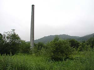再び来た道を戻り、もとの林道まで出てみると、木々の上から煙突が一本そびえているのが見えました。せっかくなので煙突の下まで行ってみることに。