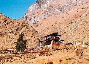 到着したこの日は首都のティンプー泊まりということで、パロから2hあまりのショートドライブの開始です。この道は国際空港から首都までの、いわば国を代表するメインロード‥のはずなんですが、舗装路面は1.5車線くらいのくねくね舗装が続きます。パロ谷の、空港がある平らなエリアから徐々に谷沿いに進んでいくと、山あいに家々が点在する乾燥地帯に入っていくのですが、これは冬だから乾燥地帯に見えるだけなのかもしれません。