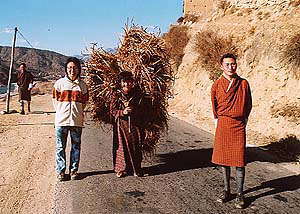 こぉんな風景が丸出しあたりまえっ!の、ブータンを代表するメイン道路。草を担ぐ女性もすごいが、しっかり一緒に写る連れの男性も堂々としていていいですなぁ。