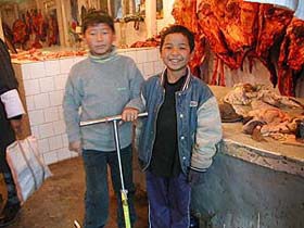干し魚を売るお姉?さん。もう店じまいなのに目の前のてんこ盛りのお魚は、さては持って帰って来週のマーケットでまた売るんでしょうね。ちなみにブータンでは殺生禁断の観点から漁師さんはほとんど(全く?)おらず、これらの魚はインド(少量はチベット方面)から輸入しているそうです。お肉屋さんで遊んでいた君たちも、もうすぐ一人前になってお手伝いをするのかな?(右の写真にマウスオンすると「もう少しお兄さん」が内臓らしき部分をさばいている画像が出てきます)。