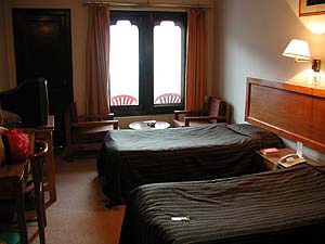 さて、この日の宿はティンプーでも大きな、そして近代的な(はずの)「ホテル・リバービュー」。確かに部屋数もティンプー随一、宿からの景色もなかなかのものがあります(町の中心部まで遠いのが難点だけれど)。ブータン最初の夜を過ごすことになるこのホテル、どんな感じなのかなと期待半分不安半分で、いざ部屋に案内されてみると‥。