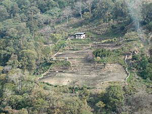 さて、ワンジュから東に向かう道はいきなり絶壁の途中をいく激しい道になります。ちなみに、パロからブムタンの一連の道路状況の中で、一番整備が良くないのがこのワンジュ〜トンサの間という感じでした。舗装状態も良くないし、どこまでが路肩でどこからが崖なのかも判然としない道をいくのですが、その途中、眼下に見える川の脇にある学校のような建物、それは刑務所だということでした。中庭ではバスケットボールをやっているようでした。何だか楽しそうだったんだけれどな(苦笑)。