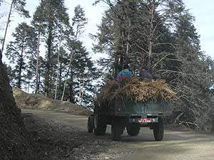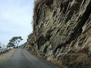 10kmほど進み、やがて道が谷に降りたところに旅行者用の宿なんかもある小さな町があったりします。このあたりにはミカンの果樹園などもあったりして、ちょっと南国を感じさせないでもありません。よく見ると、はるか山の上に物資を運ぶためのロープウェイなんかもあったりします。