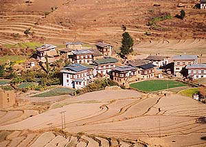 時期が時期だけにもう稲の収穫は終わっていて、あたりの風景は一面黄土色(上の写真では茶色に見えますが)。春や夏に来てみたら(夏は雨期だから大変そうですが)このあたりのイメージも全然違った、もっとみずみずしい感じなのでしょう。ちなみに左写真の中で唯一緑を保っている畑に植えられているのは菜の花なんです。このあたりも日本とそっくりですね。花はまだ1-2分咲きといったところでしたが、あ〜、おひたしにして食べたかったなぁ。