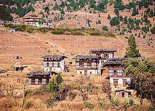 さて話がそれましたが、右の写真の上方に目指すチミラカンが写っています。民家から結構り近そうに見えますが、実際はその間にある放牧地はかなり大きく、そこからはまだ10分ほどかかります。実は「ただ今参道整備中」ということのようで、お寺の門から民家方面にかけてずっと樹木を植えて保護育成しているのですが、その整備が終わるにはまだまだ当分かかりそうです。植えられた木だってまだせいぜい人の背丈ぐらいだし。