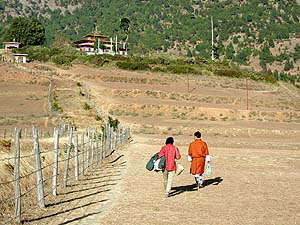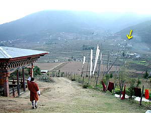 目次でも書いたとおり、ドチュ・ラ(3050m)からは長い峠道をとにかくひたすら下ってきます。何といってもプナカの標高が1300mくらいですから、一気に1700m!峠付近は針葉樹林に覆われていたのに、下るにつれて照葉樹林へ、そして棚田の稲作地帯へと風景がめまぐるしく変わっていきます。さっきまで道の横に雪があったのに、それから1時間後にはポインセチアの群落があったりするのもここブータンならではというところですな。そして広い谷あいまで降りてきた分岐のところ(ロベサという地名らしい)でプナカ方面へと向かうことになるのですが、まずはここで最初のお寺見学ということに。