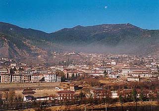 翌朝、目覚めてみると見事に無風快晴の上天気。少し離れた郊外の家々からは煮炊き用かと思われる白い煙(=木を燃料としている)が立ち上っているものの、市内中心部の家にはプロパンガスが引かれているようで煙もなし。ちなみにこの国では樹木の無許可伐採は違法なんです。また許可もそう簡単には下りないんだとか。さすがに「文化の根幹は森林にあり、よってわれわれは森林を伐採しない」と1990年代初頭に宣言した国ブータンです。どっかの島国の先進国のほうがイカンなぁ。