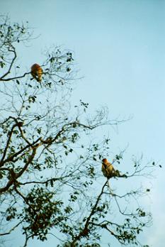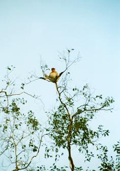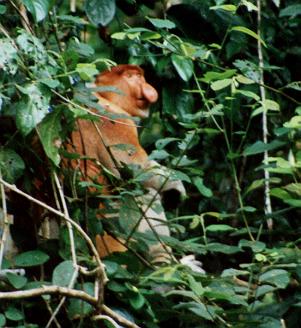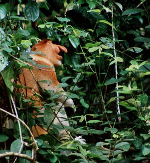 テングザルの名前の通り、鼻がテングなのですね。特に横から見ると何ともいえずユーモラスな顔をしています。ボスザルを中心にして群れで行動しているのですが、木から木への渡り方はおせじにもうまいとはいえず、とにかくえいやっとジャンプし、そこらにある木の枝に強引にしがみつくという感じで、彼らが移動するときは相当に大きな音がジャングルにこだまします。