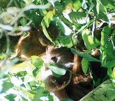 駐車場で車を降りたすぐ横の木の上にいきなりオランウータンの親子がいた。ジャックフルーツを食べているようだ。彼らはひとしきり食事をしたあと、おもむろに森の奥へと消えていった。うーん、これが本来の姿なんだろうなあ。でもこの公園はそれほど広くもないし、公園の外には広大なパーム椰子のプランテーションが広がっているのだから、ここは彼らに僅かに残された楽園とでもいうのだろうか。