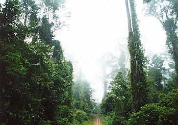 まずはロッジからテクテクと熱帯雨林の中を歩きます。左の写真、真ん中に林道が通ってますが、奥の方の樹木、道の幅から考えるに相当高いということがおわかりでしょうか?正面奥の木でたぶん40mくらいはあるはずです。でも、これを見て「なんだ、ジャングルっていうからもっと鬱蒼としてると思ったのに」と思われた方もいるかもしれません。確かに左の写真では、林道沿いゆえにそれなりの木が伐られているとは思いますが、もともと熱帯雨林の森=ジャングルは樹高が揃っていないんです。高く伸びた木がまず日光を多く採り入れ、その隙間に生えた木は、ニッチ産業みたいにわずかな光で細々と生きるけれど、所詮ニッチゆえ大きくは出られない。で、大企業というか大樹木とニッチ樹木とで、ほとんどの富=日光は搾取されてしまうわけですね。だから、昼でも地面に直接当たる日光っていうのはほとんどないわけです。従って、地表面には案外植物が育たない。我々のイメージするジャングルといえば、移動しようにもにっちもさっちもいかない密生を連想しますが、決してそんなことはないんです。かつて食生態学者の西丸震哉さんもおっしゃっていましたが、ジャングルの移動よりもキツイのは東日本以北のヤブコギです。沢登りをやった人ならわかるかもしれないけれど、雪で根の曲げられた小灌木を下から押し上げつつ登るのはキツイよなあ。ここでは歩きながら地面が見えるもの、だから案外楽勝。もちろんヒルは出るし、ジャングルの中では方角も分からなくなりますけどね。