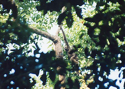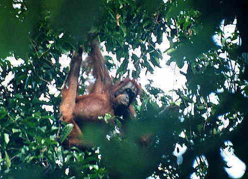 こちらは野生のオランウータン。親子で木から木へと移動中のものを撮った写真ですが、子供のほうはこちらから見えないあたりの居心地が良かったのか、ずうっと動かないまま。母(写真)だけがうろうろ動き回っていました。ちなみに、このコンテンツのあとの方で出てくるSepilokオランウータン保護区で野性に帰る訓練を受けた猿たちの一部は、この地域で放されるということですから、もしかしたら、彼女も以前はあっちにいたのかもしれません。
