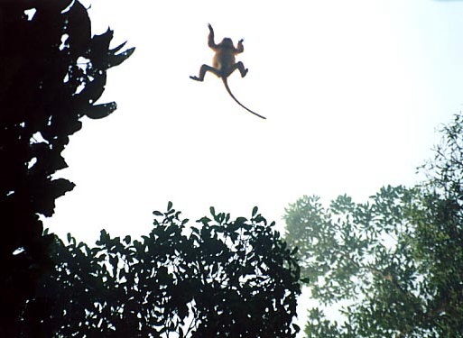 木から木へとジャンプして移動する、さすが野生の猿。40-50m真下からの撮影。