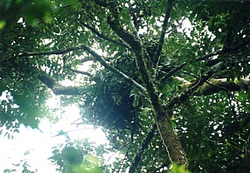 これは何かわかる人はすごい。木の真ん中になんだか小枝をかき集めて作ったような固まりがありますよね。これは「オランウータンのベッド」なんです。彼らは当然木の上で寝るわけですが、毎日夕方になるとこのようなベッドを作るわけです。そうして朝になるとここから移動をはじめ(食べ物を探しながら)、そしてまた別の場所でベッド作り。ベッドは使い捨て。同じ所で寝ることはありません。その理由をスティーブさんに尋ねると、「葉付きの枝は彼らの食料にもなるんだけれど、彼らは新鮮なもの(その日に取ったもの)しか食べない。だから、ちょっとしなびたようなベッドにわざわざ戻って来ることに意味はないし、また、何日も同じベッドで寝ると病原菌が繁殖したりするからだろう。さらに、蛇などの敵がしのんでいることもあるから、そういう危険から身を守るためでもあるらしい」というようなことを説明してくれました。