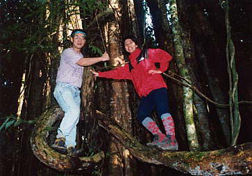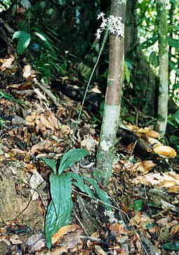 森の中には、ある場合は上の写真のように地表から、そしてある場合は大木に着生しながら生きている野生のランが多く見られます。ここでまたスティーブさんの一言。「このランの花、全然花のにおいがしないでしょう。木の上に着生しているランの花にはにおいがあるんです。それは、樹上のランは何たって上空にありますから、お客さんをわざわざ呼ばなければ受粉が完了しないわけで、そのためににおいを発しているんですね。」とのこと(だったと思う)。なぁるほど、子孫を残すためには色々やらなきゃいけないんですねえ。
