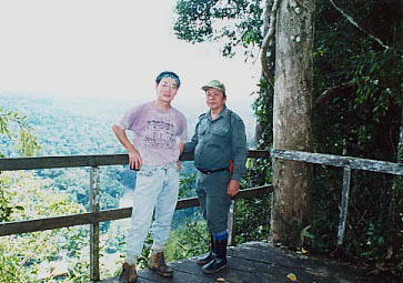 そしてこちらが展望台からの写真。これまで「スティーブさんが…」と何回も書いてきましたが、こちらがそのご本人。こう見ると結構お腹でていらっしゃるなあ(笑)。でもジャングルの中の動きはさすが。ルートをはずれて薮の中を縦横無尽に歩き回ったときも、さて戻ろうという段になると道無き道をどんどん進んで、ルートをはずれた最初の地点に確実に戻ってきたんです。しかも地形はでこぼこしていて見通しは利かないところをですよ。「自分で目印を見つけながら歩いてきたから、このくらいの距離ならどうってことないよ」とはおっしゃいますが、Takemaも元、いや軟弱ながら現役の山男、オリエンテーリング系ルートファインディングに関しては少なくとも素人じゃない。でも、ありゃあ迷うな。