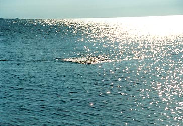そして再度の入水。でも、しばらくして何だか気分が悪くなってきた。「うっこりゃいかんかもしれん」と早々に浜に上がるが気持ち悪さは取れず。どうやら初チャレンジでコーフンしたあげく過呼吸みたいな感じになってしまったらしい。う〜気持ち悪いなどと思いつつちょっとだけお酒飲んだらさらに気持ち悪さが倍加した(自爆)。多少ましになってきたところで「そーいえばおしんこどんは…」と思ってあたりの海を見渡すがそれらしき姿はない。さては海流にでも流されたかっ!‥と、しばらく心配していたら、かなりの沖合にて楽しそうにばしゃばしゃやっているのが見えた。あ〜良かった。