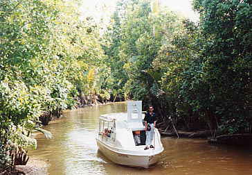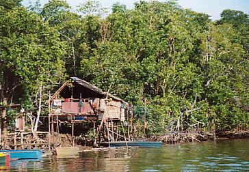 こんな見物をしながら、まだあまり整備されているとは言い難い道をJettyへ(ここまでの道は整備が始まっていたから、数年後は全く違った快適なものになることでしょう)。さて、Jettyそのものの場所がマングローブ生い茂る入り江の一番奥に変更されておりました(写真右)。おいおい、なんだかディズニーランドの探検ツアーみたいになってきたなぁ。水面には大トカゲがぽっかり顔を出していたりするし。しかしまぁ熱帯雨林の汽水域から出発というのはいかにもいい雰囲気ではある。かつてのように、ウミガメの産卵見学というエコツアーの出発点がビニール袋やらゴミやらがプカプカ浮かぶ薄汚れた港というのではちとイメージが悪いということなのでしょうか。でも、あれはあれで現地の現実をよく表していたんだけれどなぁ。