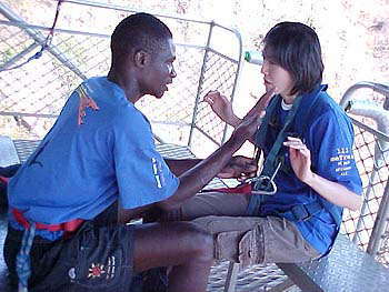 なお、このジャンプサイト、1ジャンプUS$90ということですが(2002年8月現在。これはロンプラ:Lonely Planet2001に載っている値段と変わっていませんでした)、何とビデオ撮影$40を一緒に申し込むと2回目のジャンプがただになる!という貴重な情報もいただきました。行くしかないかな、飛ぶしかないかな、来年ならいけるかな、オカバンゴデルタと組み合わせるかな。何だかTakemaもその気になってきたような‥(笑)。