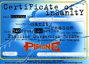 うーむ残念。この時は見学者が全くいなかったため、誰にもジャンプの瞬間の写真を撮ってもらえなかったのです(悲)。でも、ここもSkippers Canyonの71mも、見学者はまずもってほとんどいませんから、カメラを持っていっても取ってくれる人はいない可能性が高いです(99年当時。今はオプションでカメラ撮影があるかも知れません)。でも、飛んだのがウソじゃなかったという証拠に(誰も疑わないって(^_^;)) Certificate Cardを載せておこうっと(笑)。さて、ここはさすが102mのビッグジャンプ。しかもKawarau、Skippersと違い、ここの橋は歩行者専用の Suspention Bridge。歩くだけでぎしぎしいう橋(か〜なぁりコワイ)からのジャンプですから、飛ぶ時は結構恐さを感じるかもしれないなぁ‥と思っていたら、あにはからんや全然そんなことはなく、じぇんじぇん恐くなかった(笑)。でもここのバンジー、高いのは高さだけじゃなくて値段も高い。ひと飛び$100以上、しかもTシャツ別売、ビデオ別料金。商売うまいなぁ。それでもやってしまう自分が悲しい(大笑)。