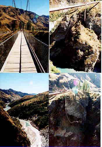 | 写真左下 お立ち台付近からジャンプする方向の景色を見るとこんなに広い!大自然の中で大ジャンプ!って感じです。でもこわいぞーっ。ちなみに下を流れるShotover川を時々ジェットボートが行き交います。こっちでジャンプやってるときは下でホバリング(というのだろうか)しながらしっかり見物していきます。 |