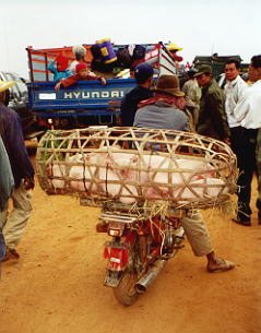 右側通行なので日本とは逆。プノンペン市内はベトナム(ホーチミン)などに比べると車、バイクの台数が少ないのでまだましだが、「センターラインとは一定の目安に過ぎない」という価値基準はここでも同じ。なお、逆走もOK(特に郊外)。トラックなどを抜かすときは、むこうからバイクなんかが来ても、相手がよける(だろう)スペースがあれば追い越しOK。なお、当然ながら過積載OK(右の写真では、ドリーム号=日本ではスーパーカブですね、の荷台に子豚を10匹入れて移動していました。こんな光景はごく日常的です)。慣れるまでは恐いかも。シェムリアップ市内及び遺跡群に関しては上記のように路面状況もよく、アンコールワットやアンコールトム周辺をはずれた遺跡エリアでは車の通行もまことに少なく、それなりに気分のいい走りが楽しめます。ま、それでもスピードは70kmを越えない方がいいでしょう。いつ何時巨大な穴が待ちかまえていないとは限りません。