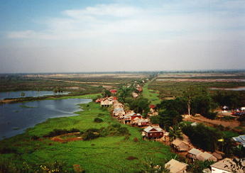 さて、トンレサップ湖は確かに広いなあと船に乗りながらも思ってはいたが、山の上からあらためて眺めてみると、やはり東南アジア最大の湖は余りにも広大なのであった。しかも、乾季と雨季とで湖の広さが全然違うのだということも、上から眺めてみてまさに理解できた。左の写真を見ると、平原のあちこちに水がたまっているのがわかるが、これらは乾期になるとすっかりひいてしまい、広大な大地が現れる、といったところなのだろう。左から右に延びた線上には船着き場に続く道路(土盛りされて一段高くなっている)が走っており、その両脇には民家。そういえば船着き場のあたりの家は「標高2cm」くらいのところにバイクが停められていたりしたし、もう少し手前ではまだ水上家屋状態の家々や水の中に生えた小灌木も多かった。乾期になれば陸続きになるんだろうな。こんな時、日本だったらどうするかな、絶対に大きな(そして周囲の風景との調和のない)堤防を張り巡らせて「これで水害の危険はなし!」とやっちゃうんだろうな。あるがままの自然に合わせて生きていくのと、自然をねじ伏せようとしていくのと、どちらがいいのかを考える時期に来ているんじゃないかな、と、この風景を見ながらふと考えた。あれ、うまくまとめちゃったな(笑)。