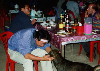 そしてそこでは、相も変わらずアンコールビールを飲みまくり(だっておいしいんだもん)、揚げ句の果ては近寄ってきた犬に構っていたらそこに猫もやってきて、犬と猫とのケンカに巻き込まれておろおろし、揚げ句の果てはその犬に吠えたてられるというような、いつものTakemaの姿があった。まあいいじゃないの、明日はいよいよシソフォン方面に移動なのだ。悪路らしいのだ。