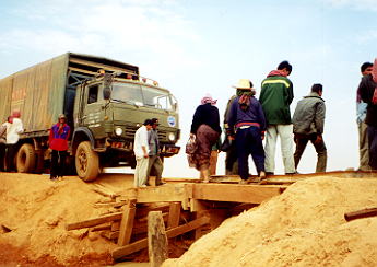 実はこの道について何枚か写真を撮ってあるのだ。しかし、写真ではその凸凹の現実がわかりにくいのであえて割愛します。だって、画像を見て「なんだこんなもんか」と思われるんじゃああまりに悲しい(笑)。で、何でこんな道になっってしまったんだろうと考えてみたわけです。「整備しなかったから(=内戦で整備できなかった)」というのは当然だけれど、整備しなくてもこんな道になるかなあ。そこではたと思ったのが、「もしかして、地雷か?」という仮説。カンボジア北西部は最後までポルポト派の拠点だったし、この道はまさに北西方面へと向かう道。ということは、ポルポト派か、あるいは政府軍かどうかはわからないけれど、敵の侵入を防ぐために国道に地雷を敷設した。したがって直径の大きなこの穴々はみんな地雷の爆発跡、と考えれば全て合点がいくし、国道脇で今でもやっているという地雷探査(今回は見なかったけれど)の説明もつく。