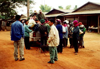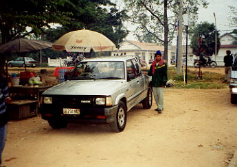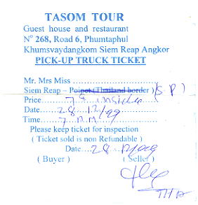さて、翌日はいよいよシェムリアップからシソフォンに向けて移動である。この区間は名だたるカンボジアの道の中でも荒れ具合がはなはだしく、バスはおろか、普通乗用車でさえも通行不能だと思われるすごい区間である。移動可能なのはバイクと、車高の高い4WDのピックアップトラックだけである(左の写真)。そんな状況ゆえ、所要時間はどれくらいかかるのか見当が付きにくい。ほとんどの人は、シソフォンには泊まらず、そこから1.5時間くらい先の国境の町 Poipetまで一気に行ってしまうのだが、人によっては12時間近くかかったらしいのだ。その人の場合、シソフォン〜シェムリアップの約110kmを10時間はかかったことになる。実に時速11km!というわけで、国境到着が夜になるというのもいやだったし、たまには観光地以外の地方都市にも泊まりたかったので、あえて国境の手前のシソフォンまでのチケットを買ったわけだ。
