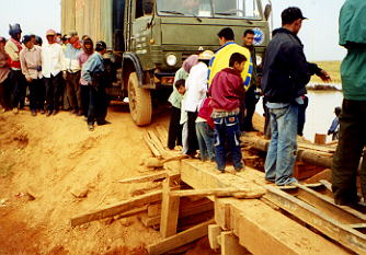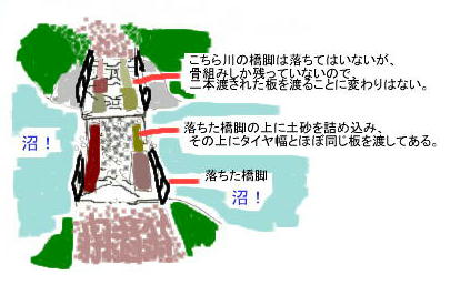 とってもつたなくて汚い絵ですみませんがガマンしてね。2つの橋げたのうち1つが完全に落ちていた。で、我々の考えからすれば「それならすぐに付け替えろ」というところなのだが、さすがにここはカンボジア。そんなに簡単にことが運ぶはずはない。しかしここは生活道路なのだから通れないままでは困る。そんなこんなで、落ちた橋げたと橋脚とのあいだに土や砂を入れ、ある程度の高さができたところでとりあえず使っていたのだが、やはり次第に土砂の面が下がる。そこでそこに板を渡して、車はその板の上をおそるおそる渡る、という現在の図式ができあがったのだろうと思う。しかしまあ、ほかにどうしようもないとはいえすごいやっつけ仕事だこと。
