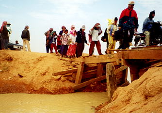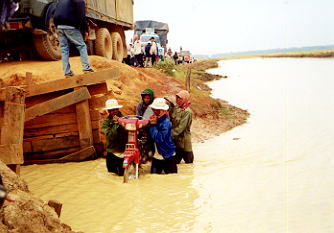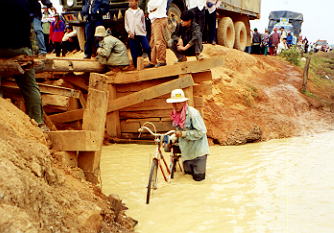 そうなると突然新たな商売が!そう、「バイクの運び屋」である。下の沼地の深さはそれほど深くはない。膝上ってところ。自転車なら押して渡れるのだが、いかんせんバイクではマフラーに水が入ってしまうのでそうはいかない。そこで何人かで「いっせーの、せっ」とバイクを持ち上げ、じゃぼじゃぼと、橋の脇を渡らせていく「商売」である。