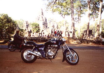 アンコールトムでバイクを停めて記念撮影。みんなが振り向く優越感