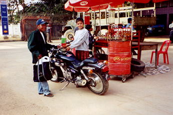 さて、カンボジアにしては(?)妙に立派なガソリンスタンド。でも、これまでに車窓から眺めていて不思議に思っていたのが、どこのスタンドでも前の方にある、ペットボトルの並べられた屋台のようなもの。「たぶん飲み物系の屋台が寄生してるんだろうなあ」と思っていたがさにあらず。実は、そのペットボトルの中に入っているのはガソリン。バイクの給油はいちいちポンプを使うのではなく、このペットボトルを使って行うわけですね。この写真、女の子の手のほうを見ると赤と緑のペットボトルが逆さまになっているのがわかると思いますが、ただ今給油の真っ最中。ゴボッゴボッという豪快な(?)音と共にガソリンがタンクの中に吸い込まれていきます。ただ一つ気になるのは、「入れ物はもともと飲料水系の容器だし、中身がガソリンとなると、容器のいろんな成分とかが溶け出たりしないのかなあ」ということ。まあ専用容器であるわけでもないし、たぶん溶けだしていることでしょう。エンジンに悪影響は…あるだろうなあ。