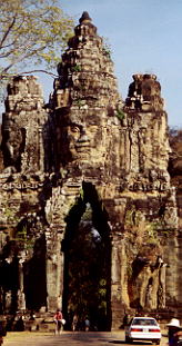 さて、これから向かうアンコールトム、左の写真でもおわかりの通り、巨大な人面がポイントの遺跡で、造営されたのはアンコールワットよりも少し前。この巨大な門の下をバイクでくぐり抜けていいというのだからなんともおおらかである。ツアー客を乗せたマイクロバスも何台か通過していくが、やはり自分の(?)バイクで走る喜びは何ものにもかえがたいものなのだ。