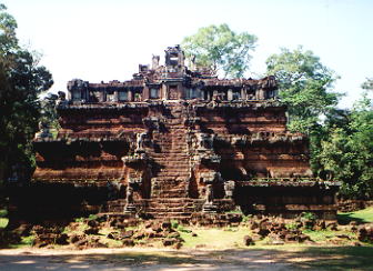 その写真がこれ(左の写真)。この傾斜、登るのはまだしも降りるのには相当の緊張が必要だ。もっとも、さすがに僧侶や王が登ることを考えてか、四方のうち一つは多少ゆるめの傾斜で作られているので、そこを登ればまあ普通の人でも何とか(楽々という意味ではない)登ることができる。