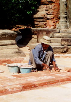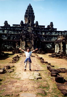 さて、そこから程近いところにあるプリア・コー寺院。狛犬ならぬ狛牛が何ともいえずユーモラスだ。ここでは台座の部分を現地の人たちが煉瓦を敷き詰めて修復中であった。建物とマッチングした丁寧な修復で、「頑張って下さい」と心の中で声をかける。バプーオン遺跡の修復に、某フラ○スの援助団体が基礎工事に鉄筋コンクリを流し込んでいるのを見たときは「何やってんじゃ」と思ったが、こういう地道なお仕事を見るとホッとする。
